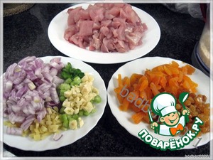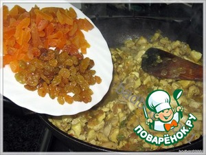 И ясное дело, если в начале первого акта у нас в ингредиентах висит ружьё, нет-нет, изюм и курага, то это их выстрел - вымытые и нарезанные они с радостью летят на встречу к мясу.