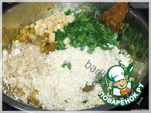 Сразу и все вместе добавим в полуготовую начинку все не лишнее, а довольно важное - петрушку, орехи, панировочные сухари, сыр, нарезанный кусочками, перчик крупного помола - и не забудем посолить (без фанатизма)
