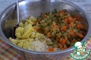 Нарезать готовые овощи некрупным кубиком. Добавить в чашу с овощами квашенную капусту и нарезанный кубиком огурец. -