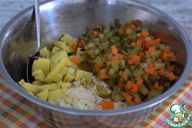 Отварить или запечь морковь, картофель и свеклу. Приведен вес сырых овощей.