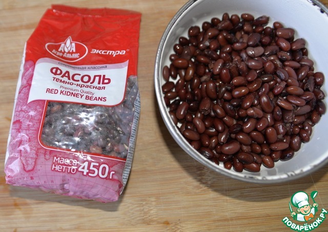Берём фасоль, я использовала тёмно-красную от Агро-Альянс. Фасоль хорошо промываем, лучше замочить на ночь. Далее воду сливаем, заливаем свежей водой в соотношении 1 к 3, доводим до кипения и варим на среднем огне до полу-готовности около 50 минут.