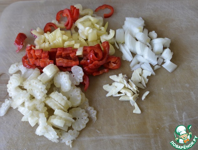 Овощи моем, чистим. Лук режем кубиками, сельдерей и перец полосками. Я использовала два вида перца. Измельчаем чеснок.