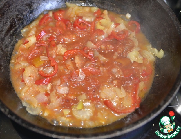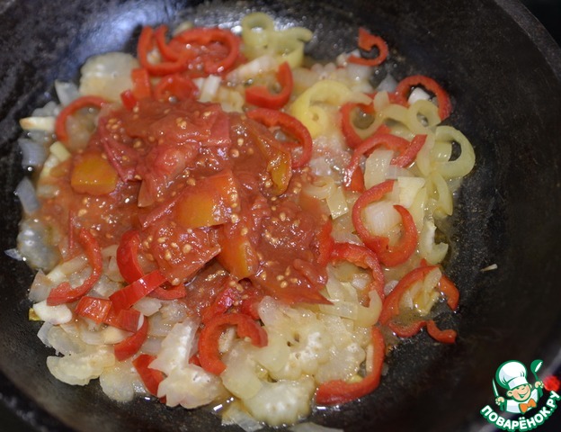 Кладём овощи на горячую сковороду (сотейник) с растительным маслом. Обжариваем на среднем огне 5 минут при помешивании, добавляем томаты в собственном соку.