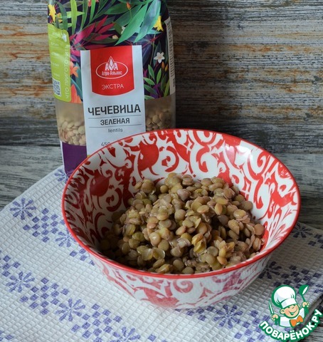 Сварить зелёную чечевицу. Я использую чечевицу от ТМ Агро-Альянс, варю с добавлением 1/2 ч. л. сахара на 1 л. воды, 20 минут. Остудить.