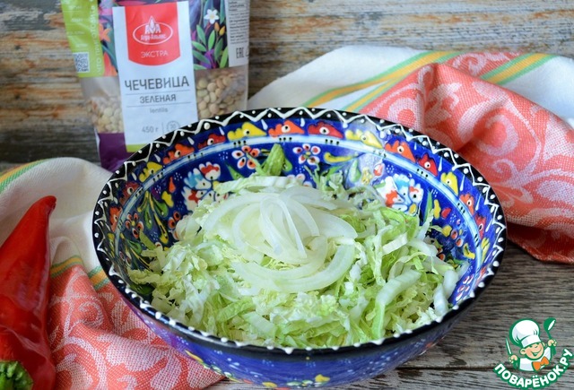 Пекинскую капусту и лук нарезать тонко и слегка перетереть с солью.
