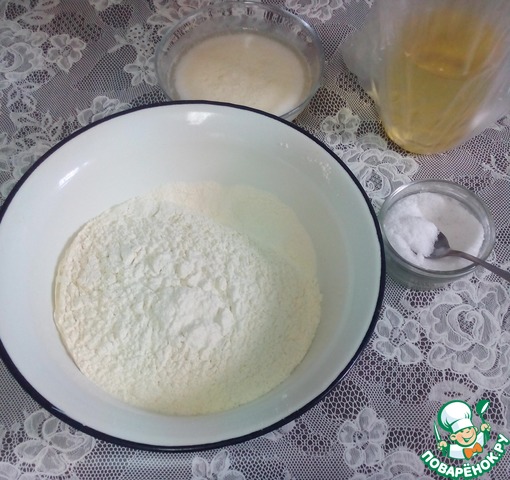 Просейте пшеничную муку. Для опары смешайте в пиале 1 ч. л. сухих дрожжей с горкой, 1 ст. л сахара, 1,5 ст. л. муки и 3/4 стакана кипячёной тёплой воды, дайте постоять в тёплом месте в течение 15-20 минут до появления пузырей или "шапочки". Затем добавьте 0,5 ч. л. соли и 1/4 стакана подсолнечного масла к опаре и просеянной муке, замесите тесто. Накройте блюдо пищевой плёнкой и дайте тесту подойти в течение 1 часа в тёплом месте.
