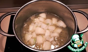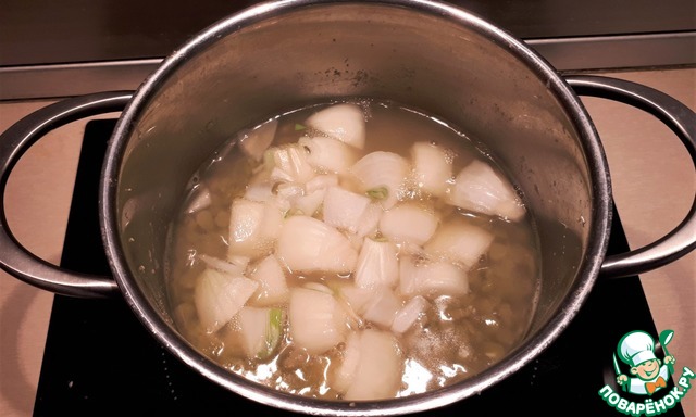 Отвариваем горох до полуготовности, отправляем к нему лук, попозже - картофель.