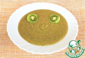 Наливаем суп в тарелку. Делаем глазки крокодилу из двух ломтиков киви.
