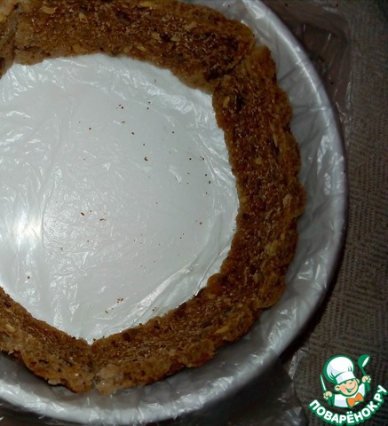Застилаем форму пленкой и бока внутри обрамляем хлебцами.