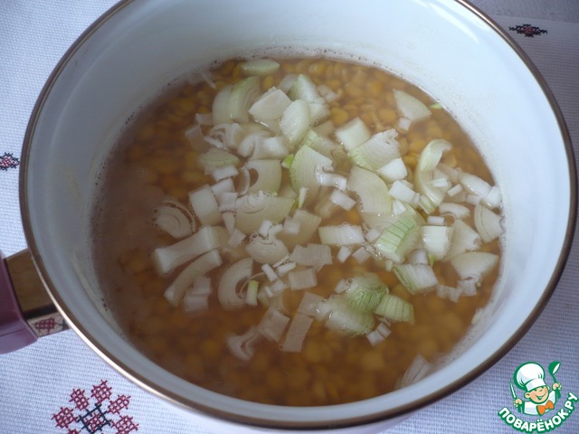• Поставить на огонь, довести до кипения, снять пену. Добавьте нарезанный лук - шалот (если вся вода выпарится, а горох еще не разварится, то добавьте еще немного воды).