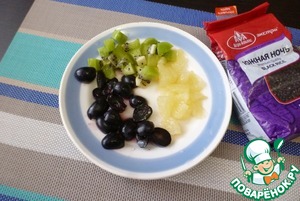 Черный виноград разрезать пополам, удалить косточки. Грейпфрут разделать на филе, удалив плёнки, и нарезать кусочками. Киви почистить и нарезать кубиком.