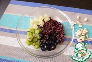 Смешать в салатнике черный рис и нарезанные фрукты.