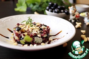 Выложить салат через сервировочное кольцо. Полить медом, посыпать орехами. Добавить несколько капель бальзамического крема.