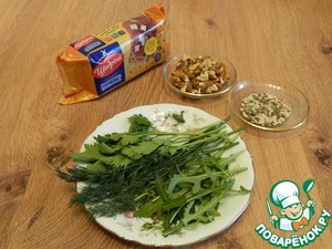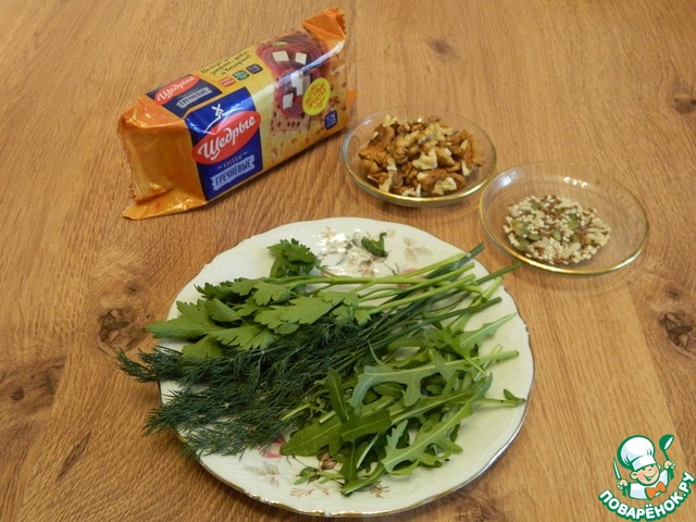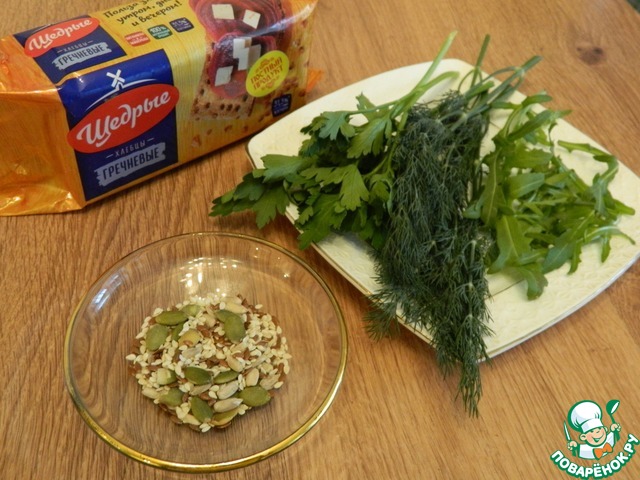 Для подачи нам понадобятся хлебцы "Щедрые", зелень, семена льна, семечки подсолнуха, тыквы, кунжут.