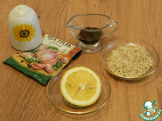 Приготовим соус. Смешаем соевый соус с соком из половинки лимона, сухим чесноком, перцем. Натрем на мелкой терке грецкие орехи.