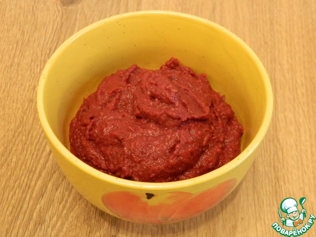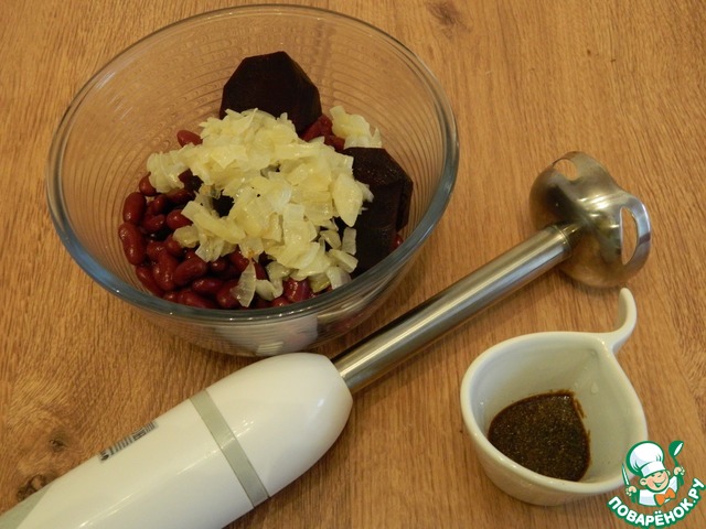 В миске смешаем хорошо промытую консервированную фасоль, свеклу, припущенный лук. Измельчим все продукты погружным блендером.