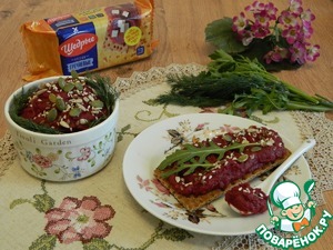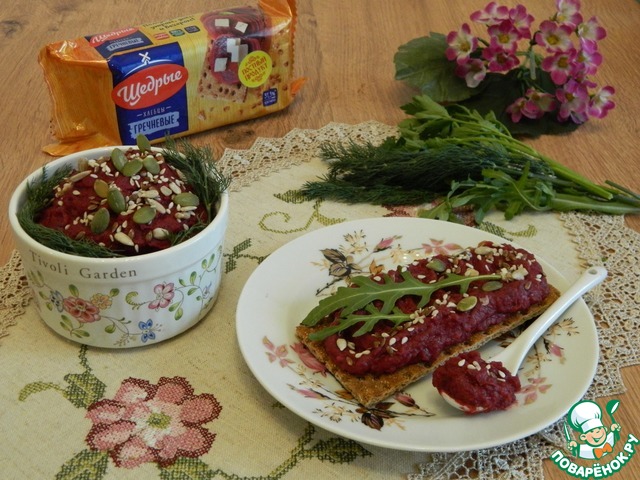 При подаче используем хлебцы "Щедрые" Гречневые. Готовую икру присыпаем смесью семян льна, кунжута, подсолнуха, тыквы.