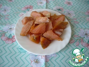 Для приготовления паштета нам понадобится красная рыба – семга (можно взять форель или горбушу). Нарезаем рыбу небольшими кусочками, произвольного размера (т. к. измельчать рыбу до состояния паштета мы будем блендером).