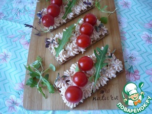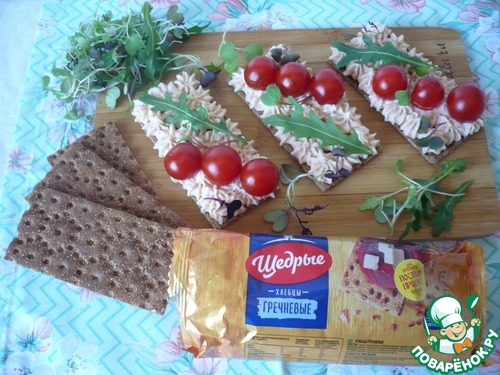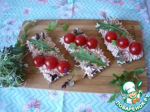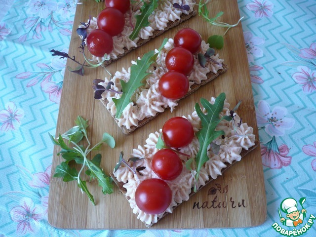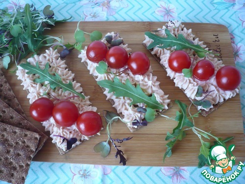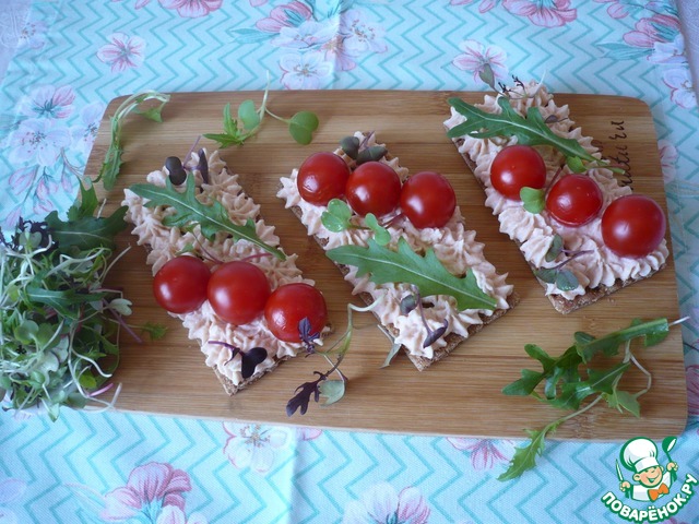 Украсьте хлебцы с рыбным паштетом помидорами черри и микрозеленью.