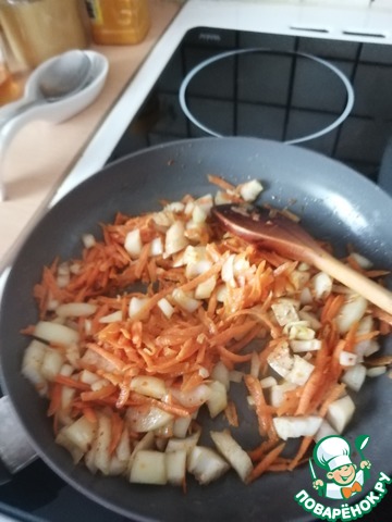 Раскалить масло и спассеровать овощи с добавлением чёрного и красного перца. -
