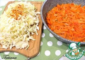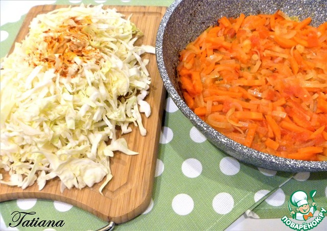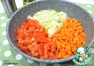 Подготовленную капусту выложите к тушеным овощам, сверху влейте пару ст. л. масла, перемешайте. Готовьте капусту под крышкой минут 10-12. Капуста должна быть хрустящей. -