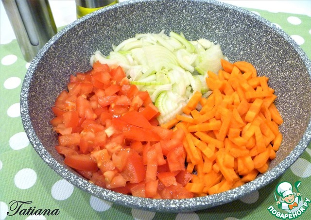 Подготовьте овощную заправку : морковь нарежьте соломкой, лук и помидоры четверть-кольцами. В глубокую сковороду влейте растительное масло (1 ст. л.), выложите нарезанные овощи, сразу немного посолите. Потушите овощи до полуготовности под крышкой при среднем нагреве.