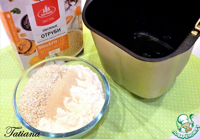 В ведёрко хлебопечки влейте горячую воду, добавьте шпинатное пюре, соль, сахар и растительное масло. Дайте смеси остыть до ~ 40-ка градусов. По верх жидких ингредиентов добавьте мучную смесь (мука+овсяные отруби+дрожжи). Режим приготовления "домашнее тесто". -