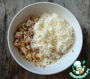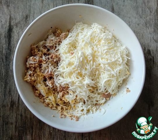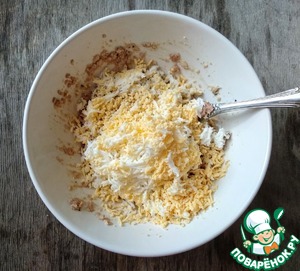 Плавленный сырок натереть на мелкой тёрке. Хорошо перемешать.