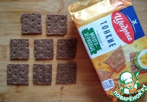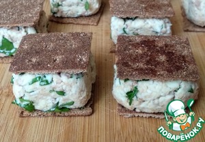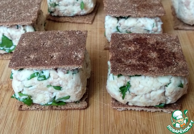 Шарики положить на кусочки хлебцев, сверху накрыть ещё кусочком хлебца.