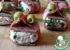 Затем обернуть полосками бекона и закрепить шпажками с оливками. У меня получилось 9 шт.