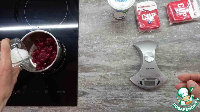 Замороженные ягоды разогрейте в сотейнике вместе с сахаром, доведите до кипения и снимите с огня. Пока будем готовить творожный слой наша начинка остынет.