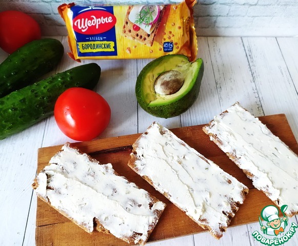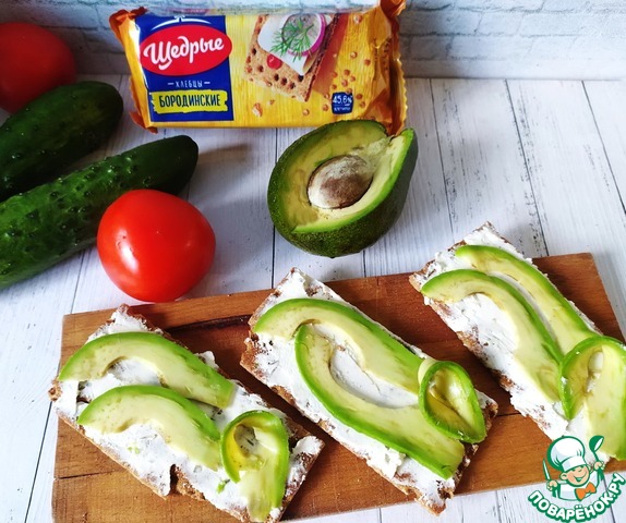 Авокадо очищаем, нарез тонкими пластинками и укладываем на хлебцы.