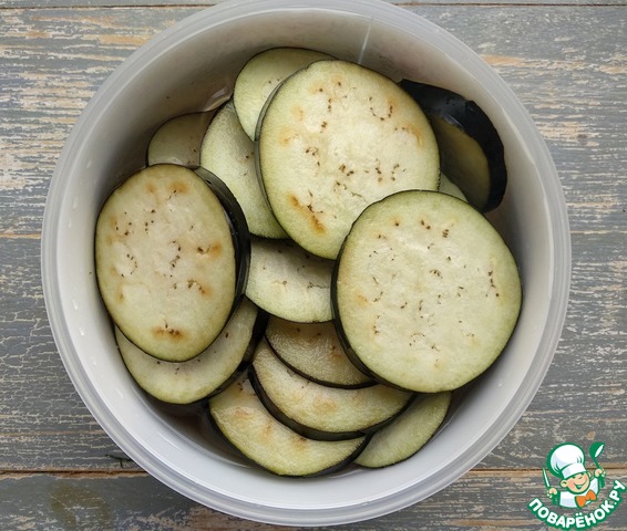 Баклажан помыть, нарезать колечками, толщиной 1-1.5 см. Поместить колечки баклажан в подсоленую воду на 20 мин., чтобы ушла лишняя горечь. Затем слить воду баклажаны обсушить полотенцем.