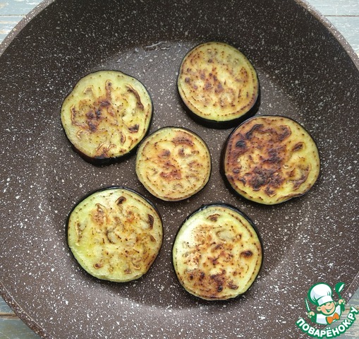 Обжарить колечки баклажан на оливковом масле (3 ст. л.), до золотистого цвета.