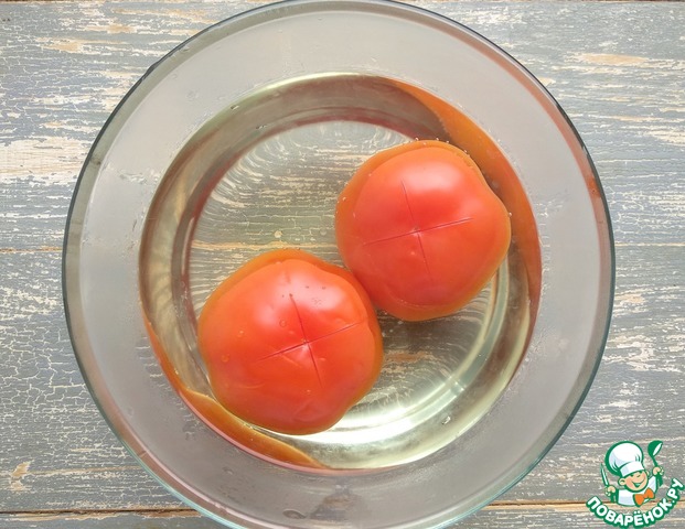 На помидорах сделать крестообразный надрез и залить их кипятком, оставить на 5-7 мин.
