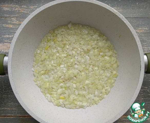 Лук почистить, помыть, нарезать кубиками. Обжарить в оливковом масле (2 ст. л.) до прозрачности.