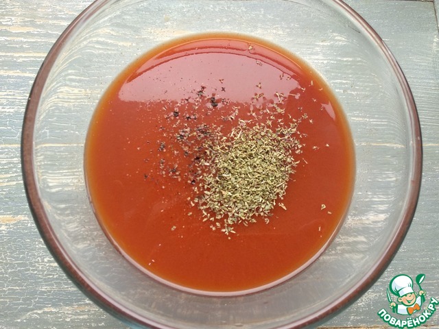 В 500 мл. воды хорошо размешать томатную пасту и соль, добавить орегано и перец.
