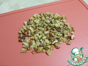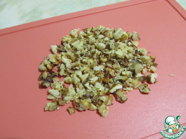 Грецкие орехи обжарить на сухой сковороде (или в духовке) и порезать не мелко.