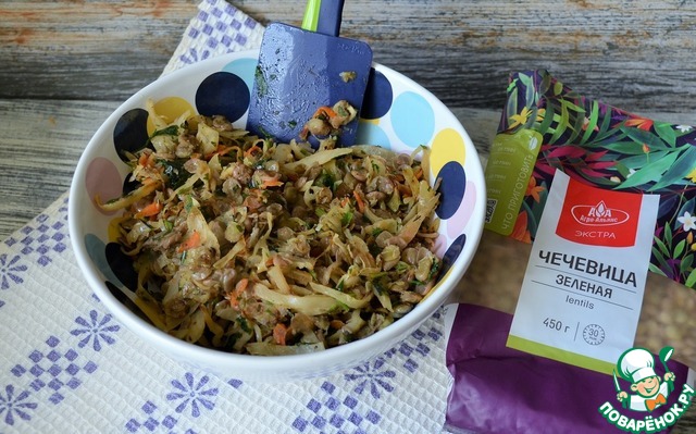 В это время приготовить начинку. Пожарить капусту с морковью, луком, зеленью петрушки, чечевицу отварить, добавить к капусте.
