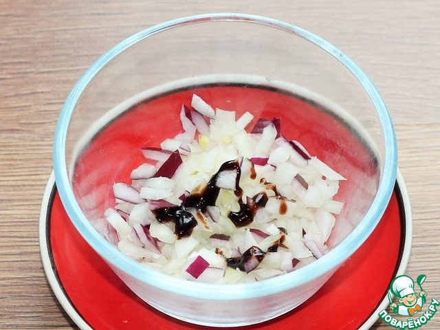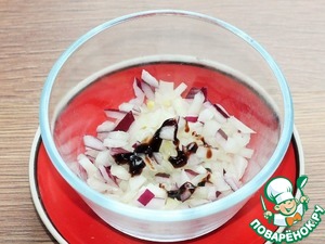 2. Мелко нарезаем кубиками очищенный репчатый лук. Заливаем горячей водой и добавляем винный или бальзамический уксус.