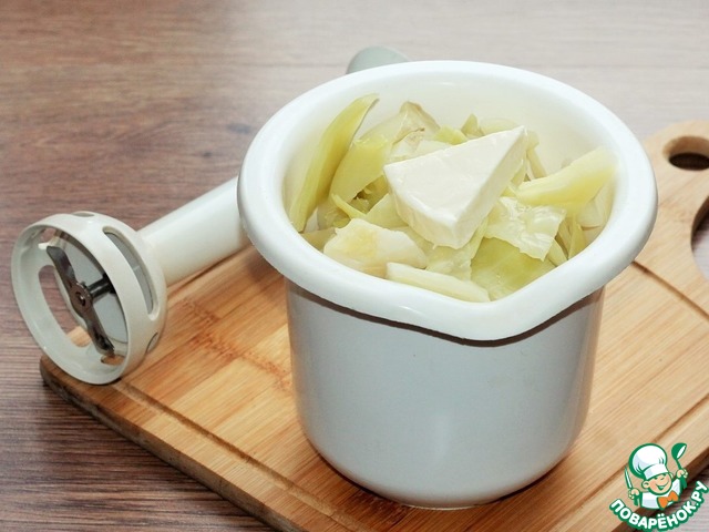 6. Добавляем 50 мл капустного отвара, плавленный сыр (2-3 шт) и измельчаем блендером.