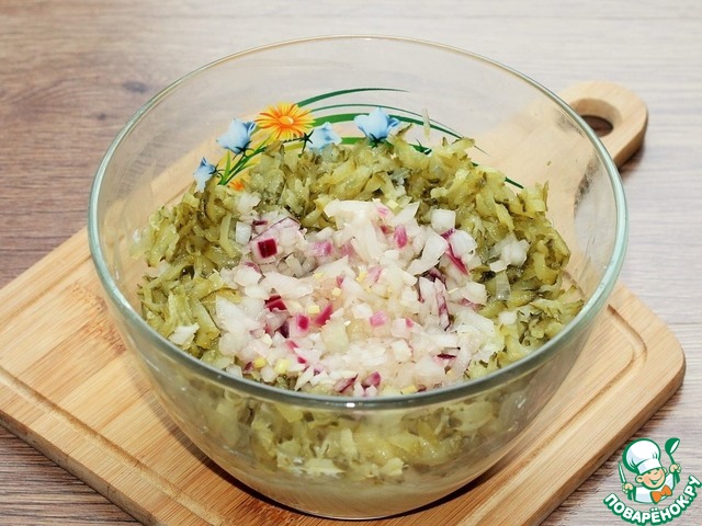 7. В капустный фарш выкладываем маринованные огурцы и лук без жидкости.