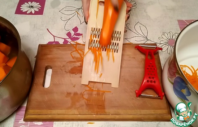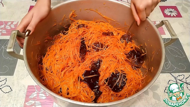 Чтобы удобно было перемешивать морковь, перекладываю ее в большую кастрюлю.