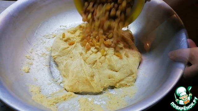 Первый раз хорошенько обминаем тесто и добавляем изюм. Предварительно можно обвалять изюм в муке (по желанию). Вымешиваем тесто около 5-6 минут, пока оно не увеличится в объёме и снова, накрыв полотенцем, отправляем в тёплое место.