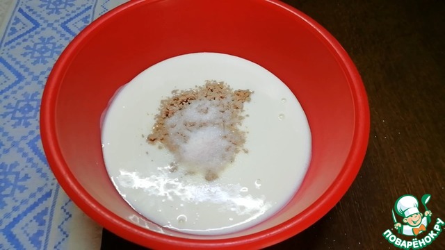 Для опары нам понадобится 500 мл тёплого жирного кефира. В миску с кефиром отправляем 50 г прессованных дрожжей, 2 ст. л. сахара и 100 г пшеничной муки. Всё перемешиваем и ставим опару в тёплое место приблизительно на 20 минут.
