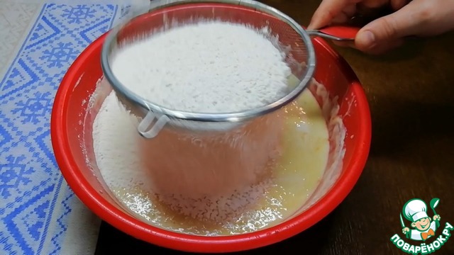 Затем порционно просеиваем 1 кг муки. Муку предварительно я уже просеяла, в тесто я просеиваю её второй раз. Т. е. мука должна быть просеяна дважды.