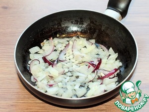 2. Лук и чеснок очищаем, лук нарезаем кубиками, чеснок - мелко рубим. На разогретом растительном масле обжариваем лук, через 2 минуты добавляем чеснок, обжариваем до "прозрачности". Добавляем в сковороду чабер у меня сухой, молотый.