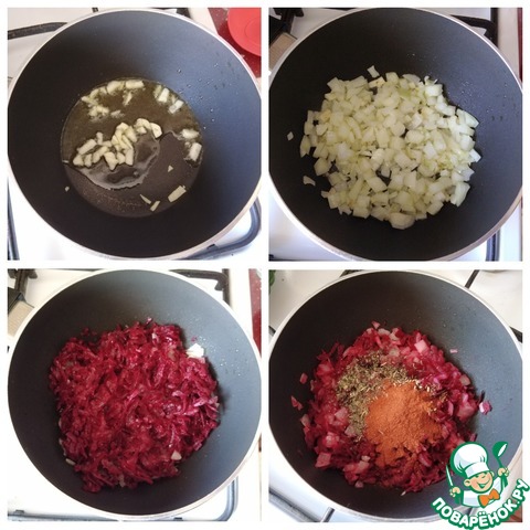 В сотейник налила масло, разогрела его и выложила мелко порезанный чеснок. Через минуту - мелко порезанный лук. Позолотила его. Натёрла свёклу на тёрке средней величины и отправила к луку. Потомила 10 минут при минимальном огне под крышкой. Далее выложила специи. У меня базилик, розмарин, тимьян и сладкая паприка. Перемешала. Потомила ещё пару минут. Если кто-то какие-то травы не любит, то не кладите.