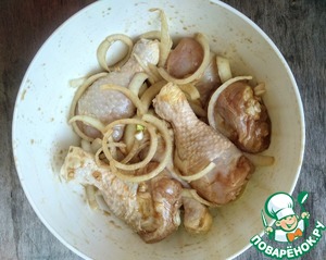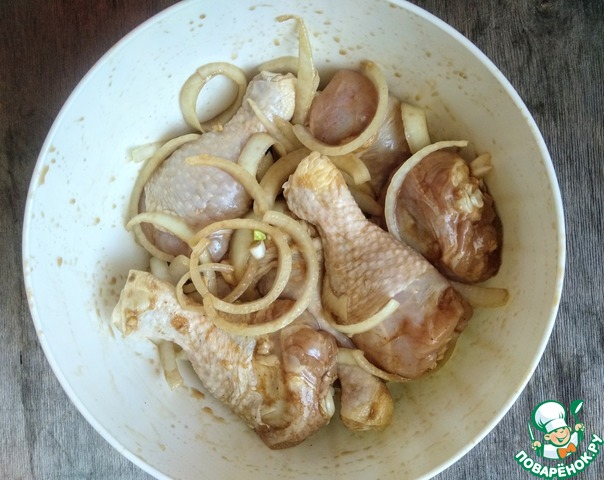 Разложить на хлебцах половину лука, сверху куриные голени. Полить маринадом и запекать в духовке, заранее разогретой до 200 градусов 20 мин.