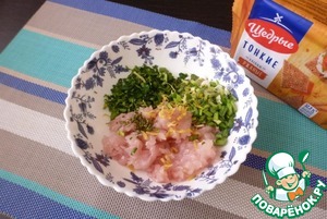 Приготовить фарш из куриной грудки, мелкоизмельченной зелени, цедры лимона, выдавленного чеснока, соли и перца. Зелени не жалейте. У меня петрушка, кинза, розмарин и зеленый лук.